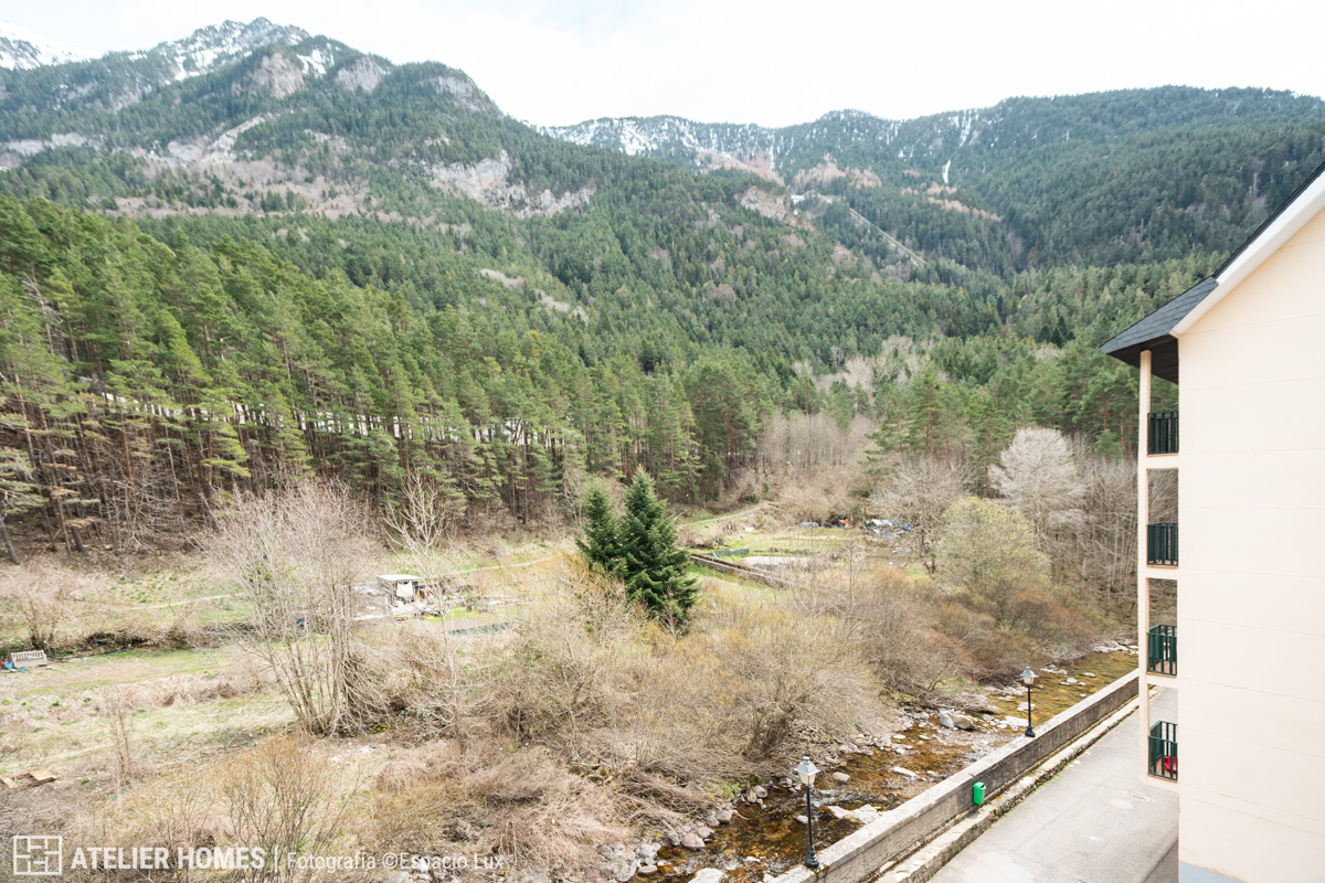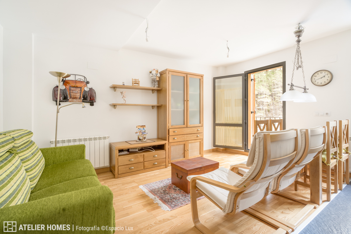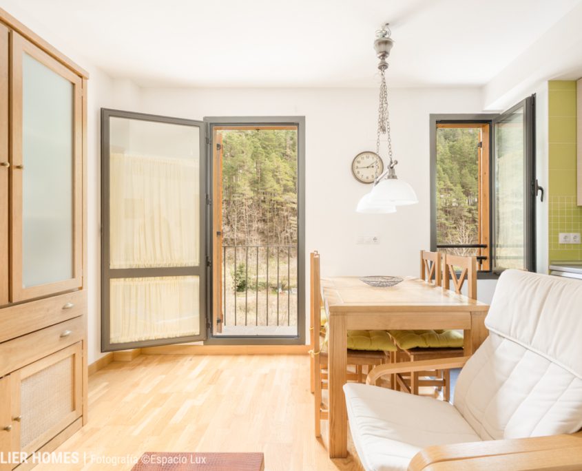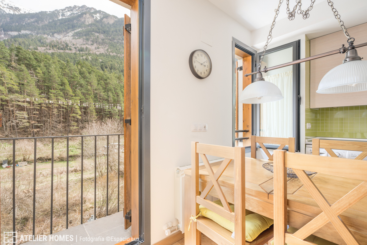 La vivienda, con aproximadamente 50 m² construidos, ofrece una distribución muy equilibrada. La zona de día se configura en un espacio abierto de salón-comedor con cocina integrada, luminoso y acogedor, con salida directa a balcón y vistas despejadas al entorno natural del Pirineo Aragonés en Canfranc-Estación.