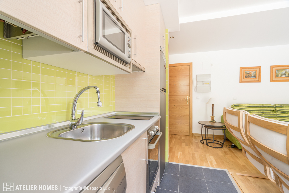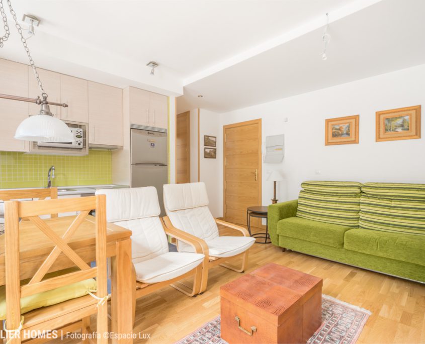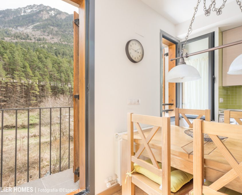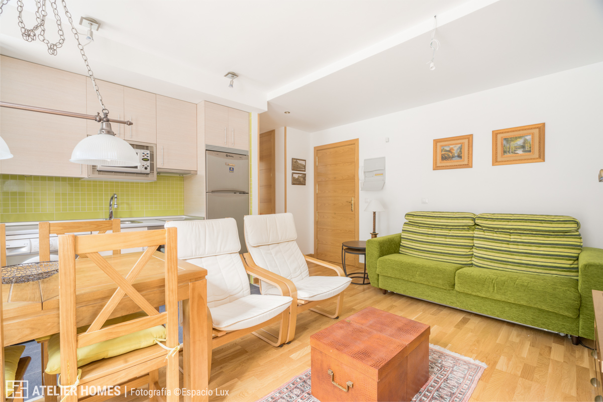 La vivienda, con aproximadamente 50 m² construidos, ofrece una distribución muy equilibrada. La zona de día se configura en un espacio abierto de salón-comedor con cocina integrada, luminoso y acogedor, con salida directa a balcón y vistas despejadas al entorno natural del Pirineo Aragonés en Canfranc-Estación.