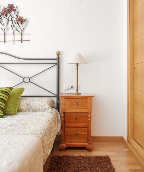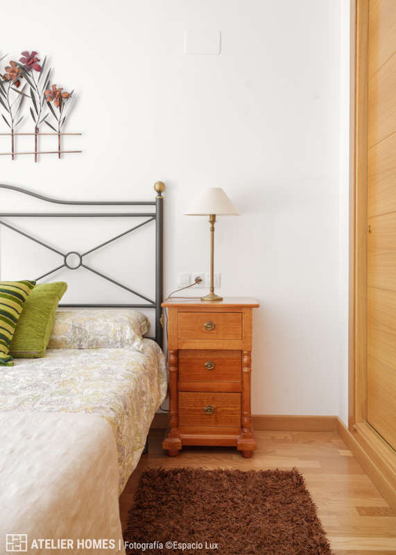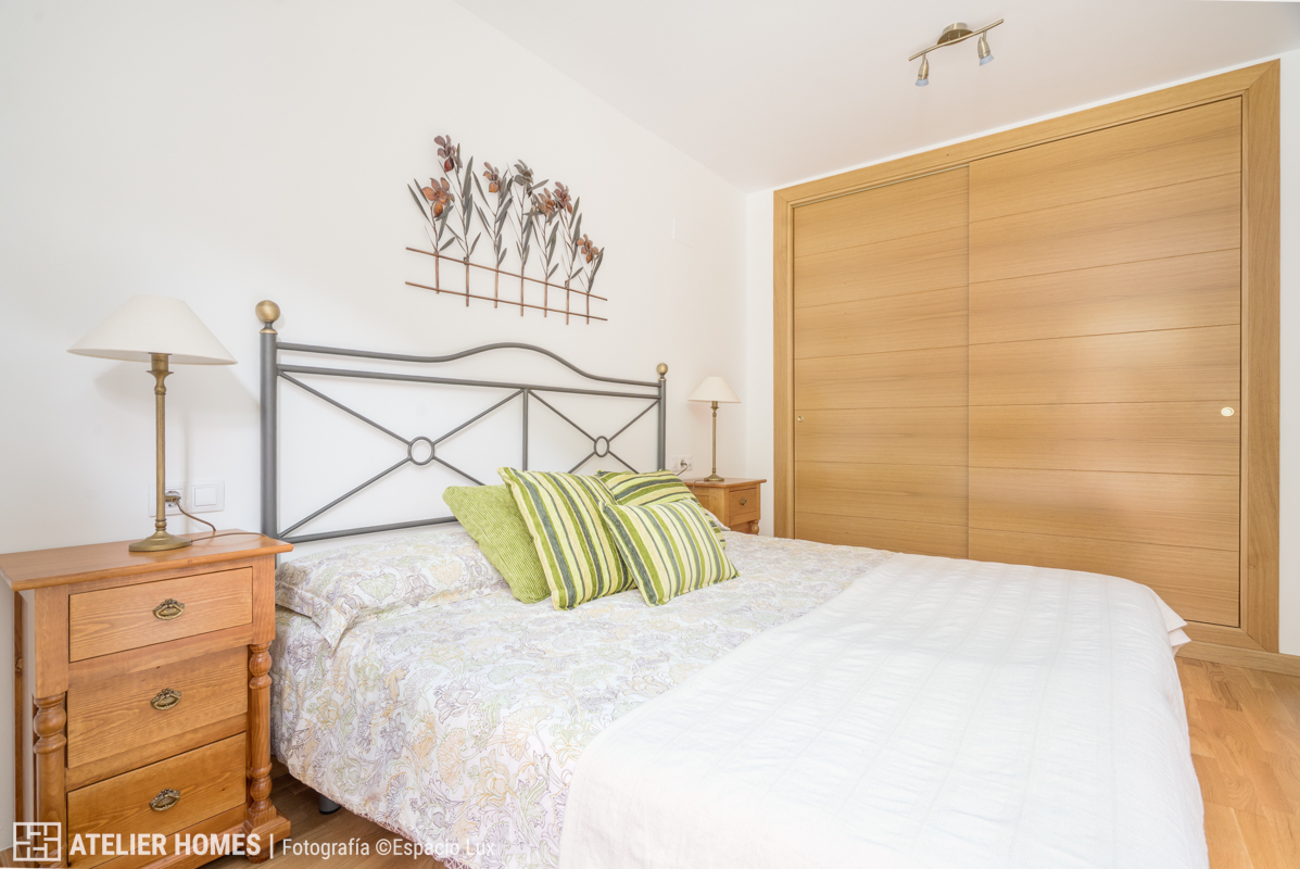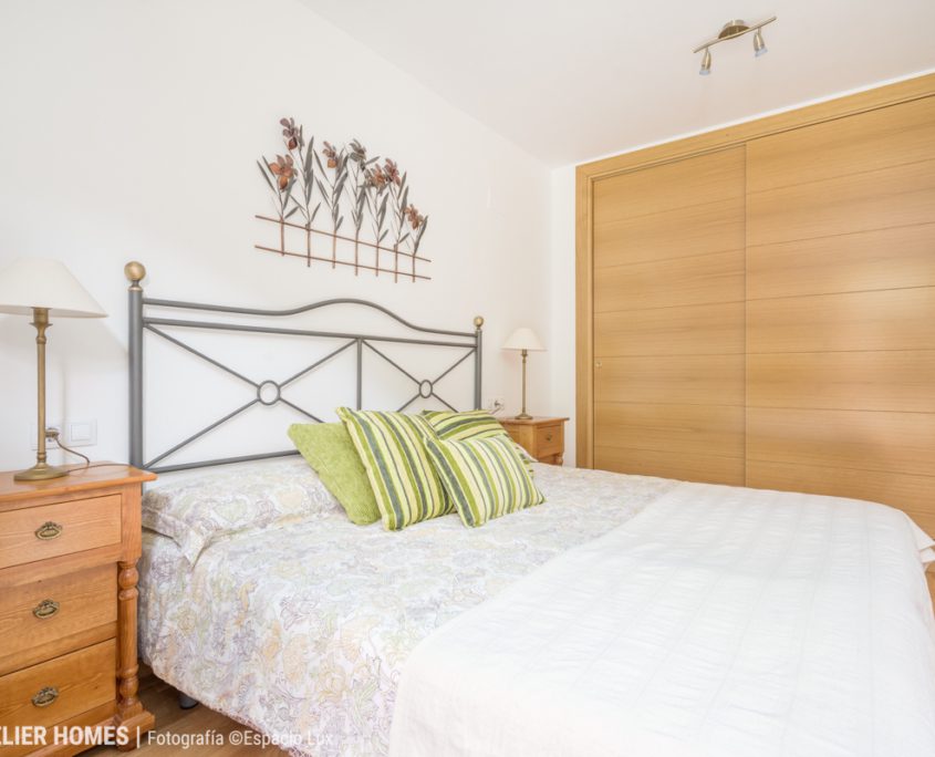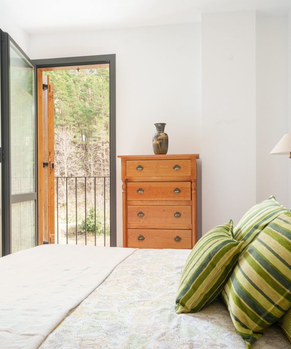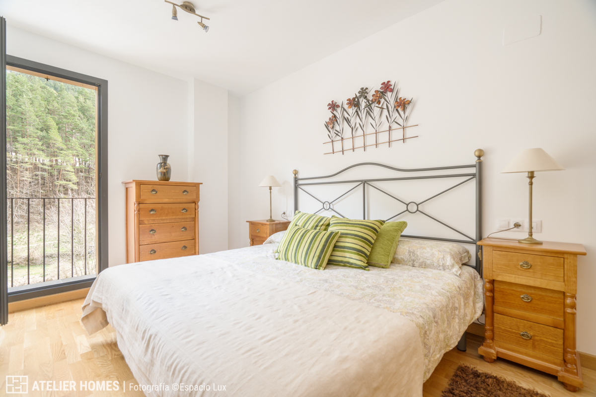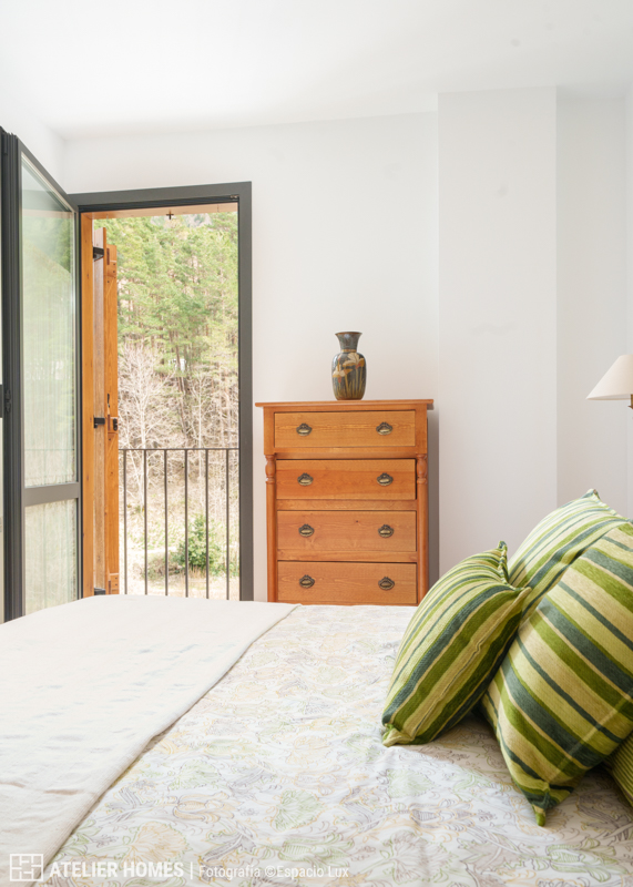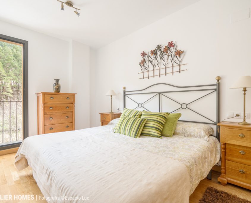 El dormitorio principal, amplio y bien proporcionado, dispone también de acceso a balcón, lo que refuerza la entrada de luz natural y la conexión con el paisaje. Destacan sus armarios empotrados, de gran capacidad y construcción robusta, un elemento clave para el uso en vivienda de montaña.