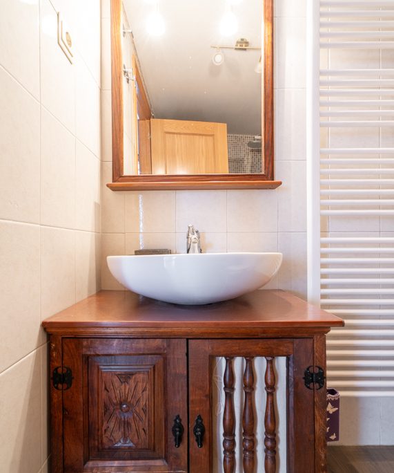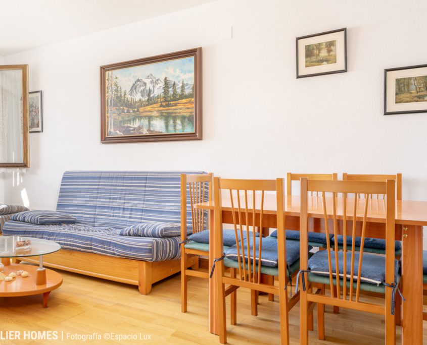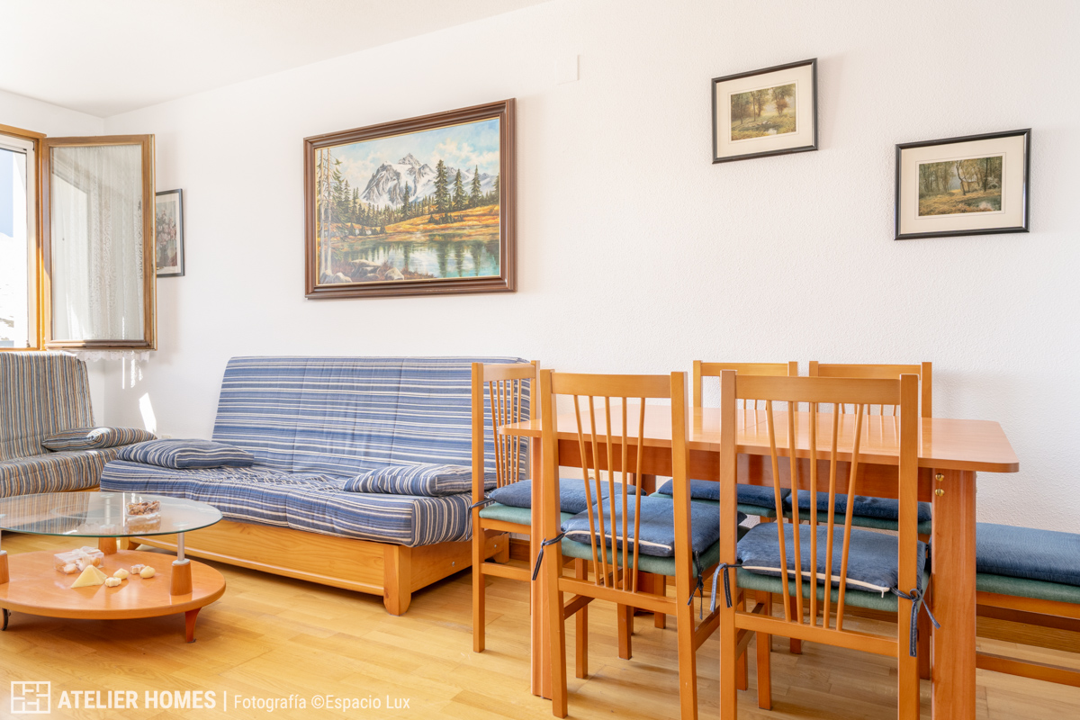 La zona de día se articula en un espacio único de salón-comedor con cocina integrada, una configuración muy valorada actualmente por su amplitud, funcionalidad y aprovechamiento de la luz. Este ambiente principal, bien dimensionado y confortable, se convierte en el corazón de la vivienda, con una conexión directa con el exterior y unas vistas que refuerzan claramente su carácter de vivienda de montaña.