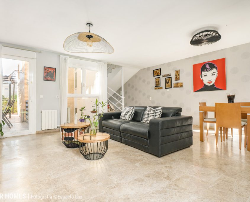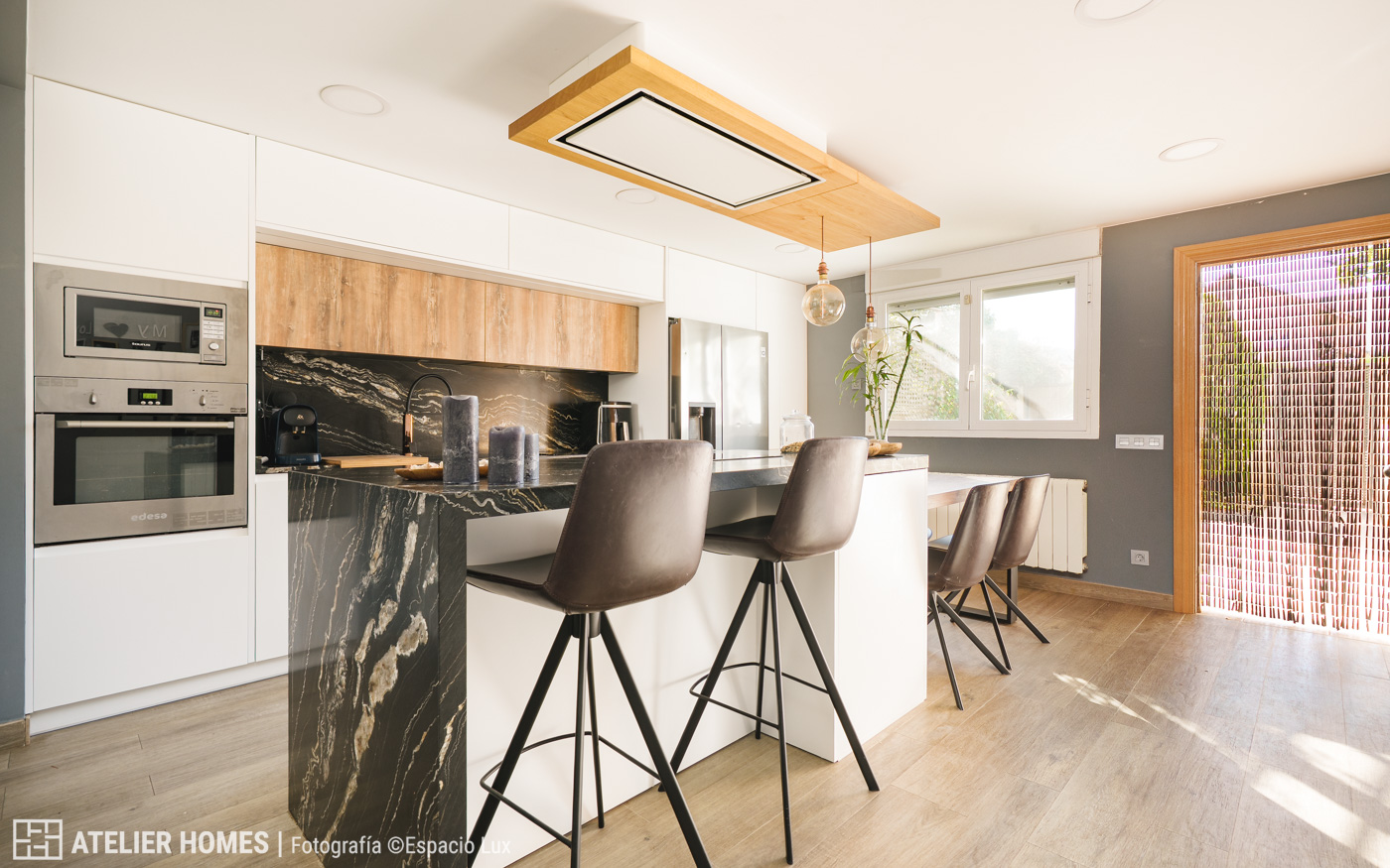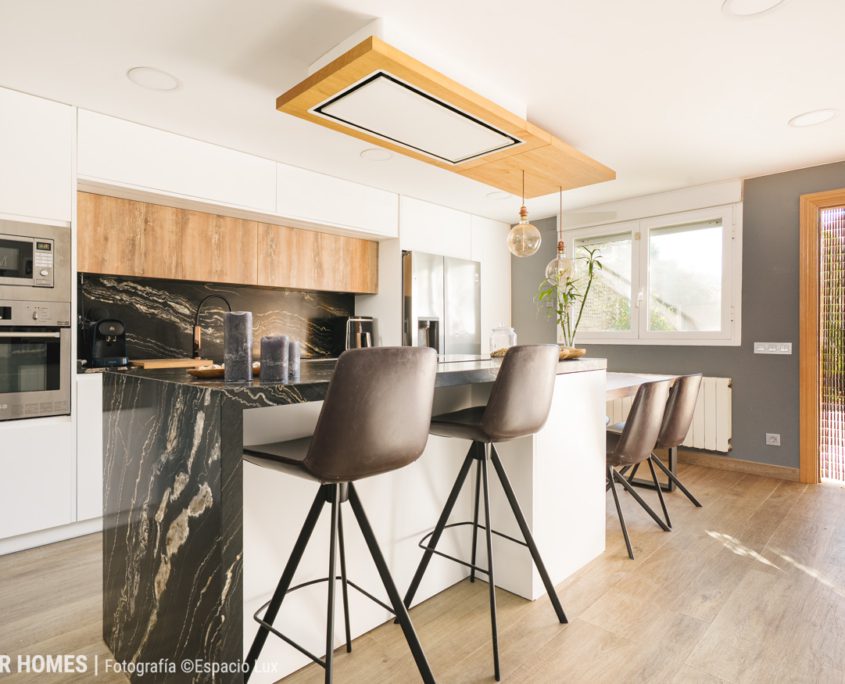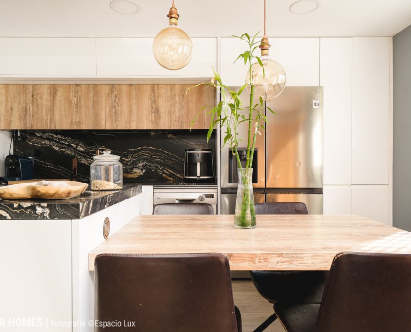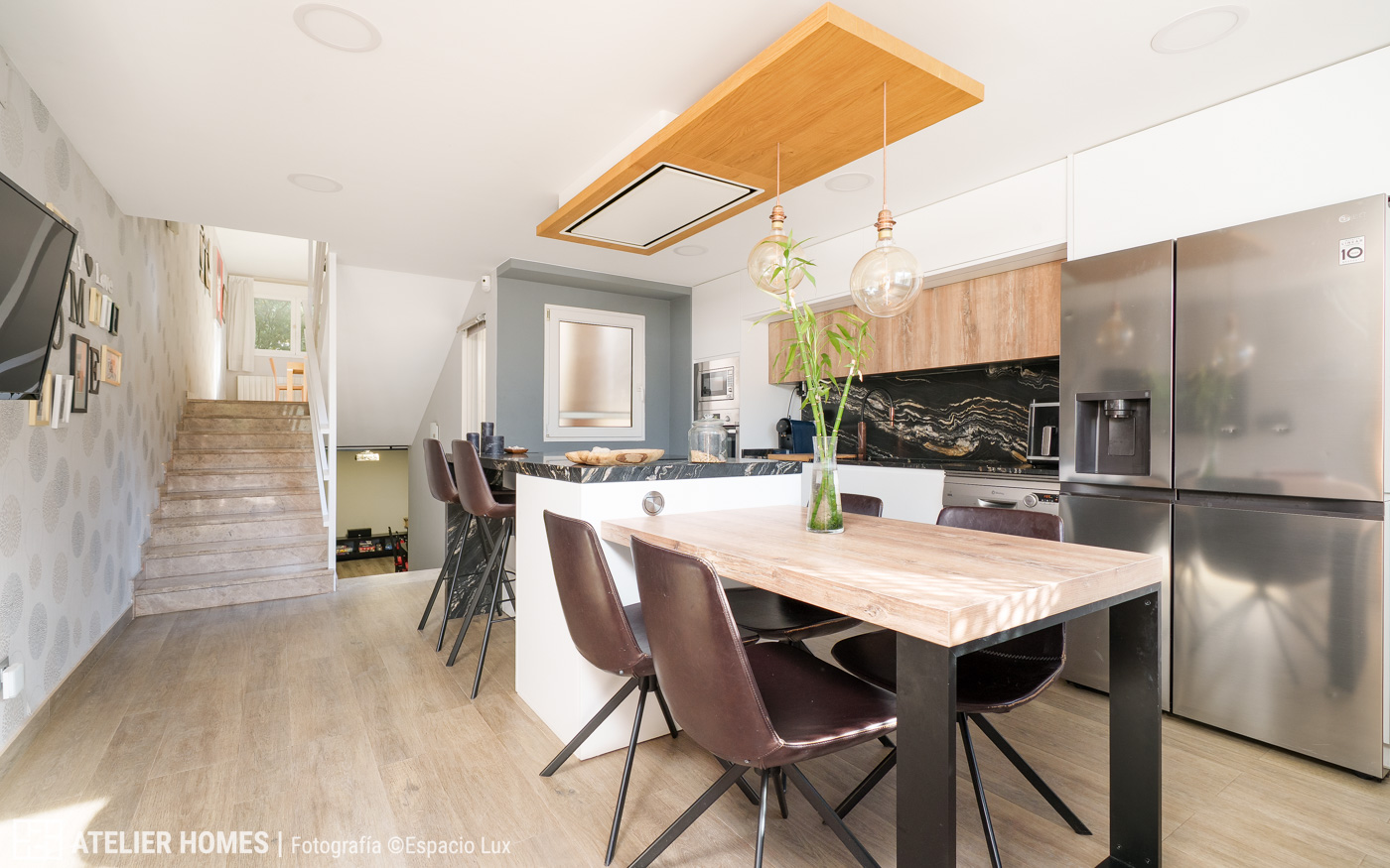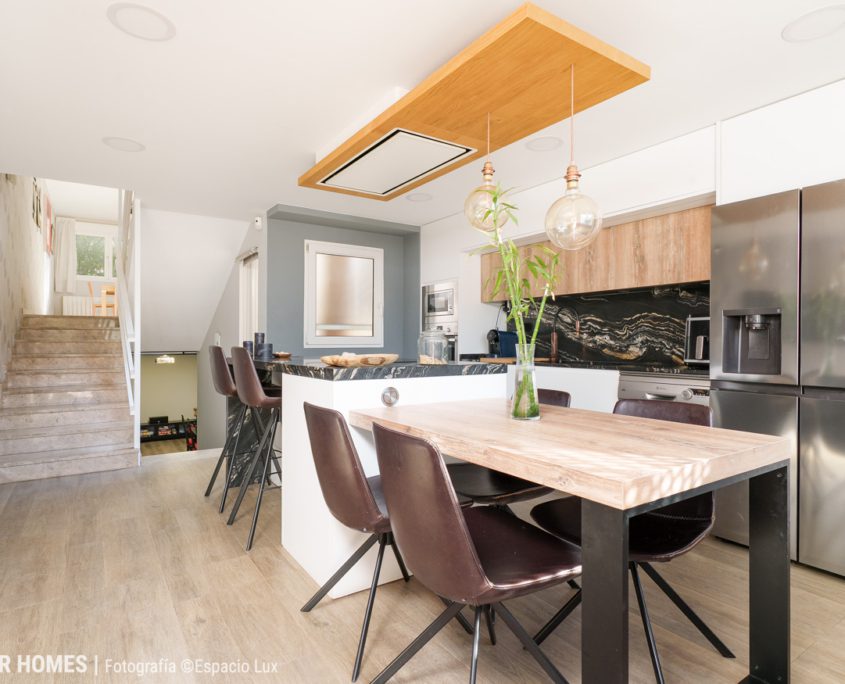Con una superficie construida de 230 m² distribuidos en tres plantas, la vivienda destaca por su diseño funcional, luminosidad y calidez. En la planta principal, un amplio salón-comedor con acceso directo al porche y la piscina se integra con una cocina de diseño completamente reformada, equipada con isla central y zona office, creando un ambiente moderno y acogedor.