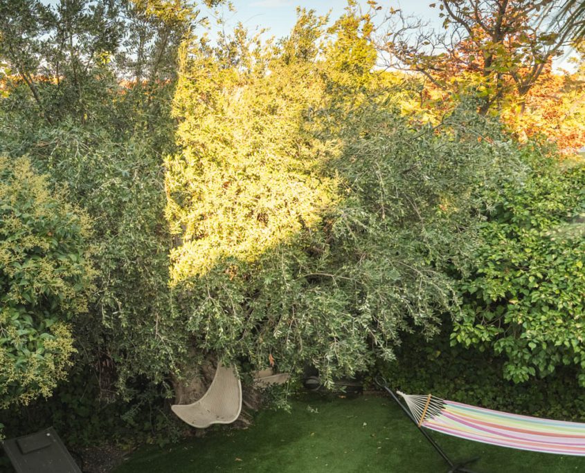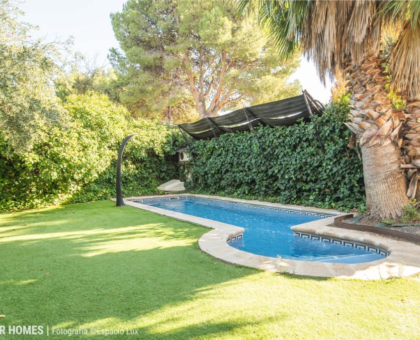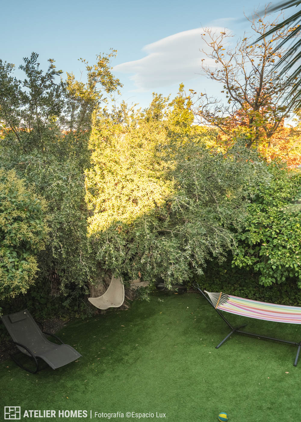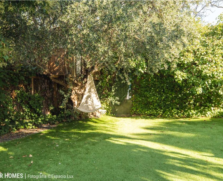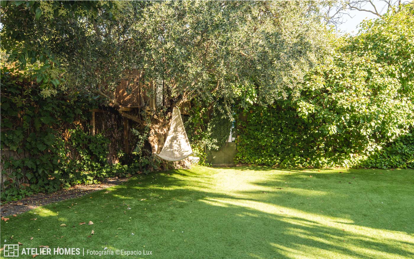 En el exterior, el jardín con césped artificial, barbacoa y piscina privada conforma un entorno perfecto para el descanso y la vida al aire libre, rodeado de vegetación y total tranquilidad.
