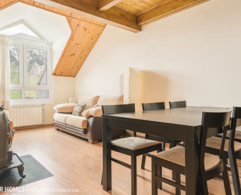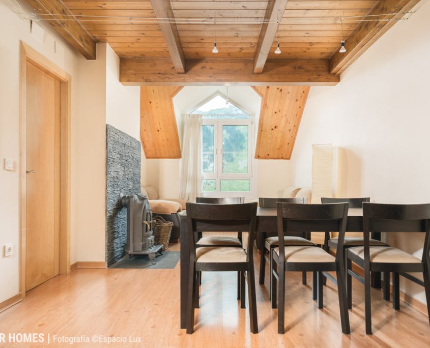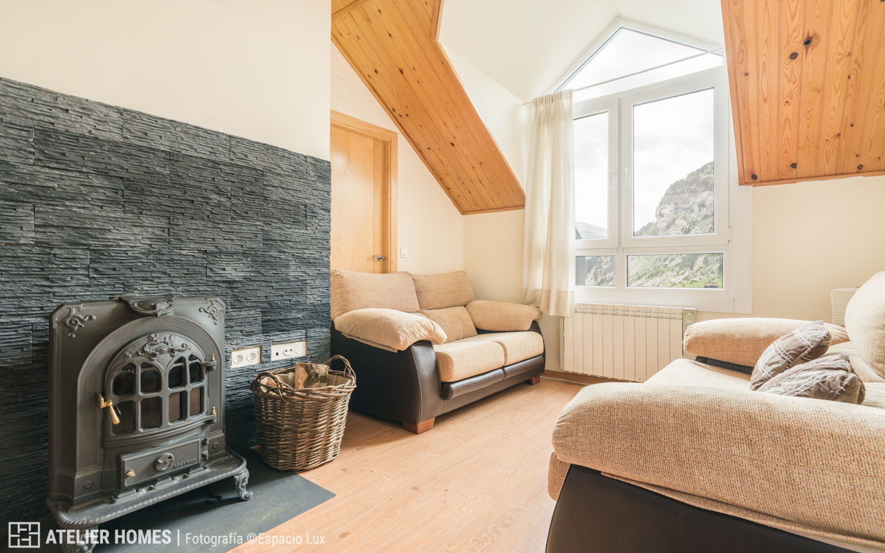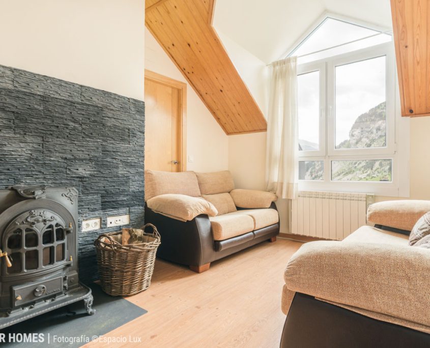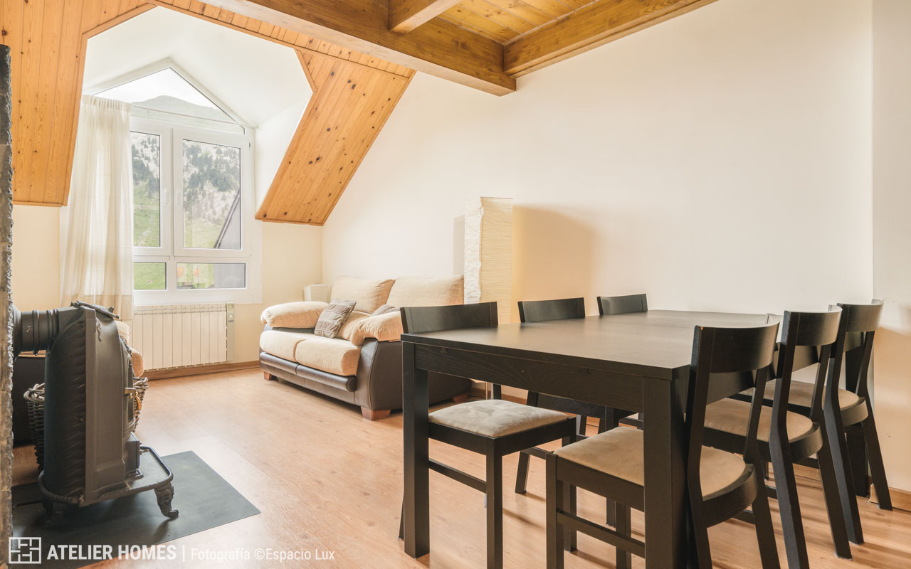 Un hogar diseñado para disfrutar tanto del invierno como del verano, gracias a su cuidada distribución, excelente orientación sur y espectaculares vistas a las montañas del Pirineo aragonés.