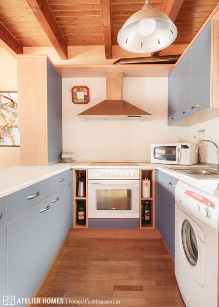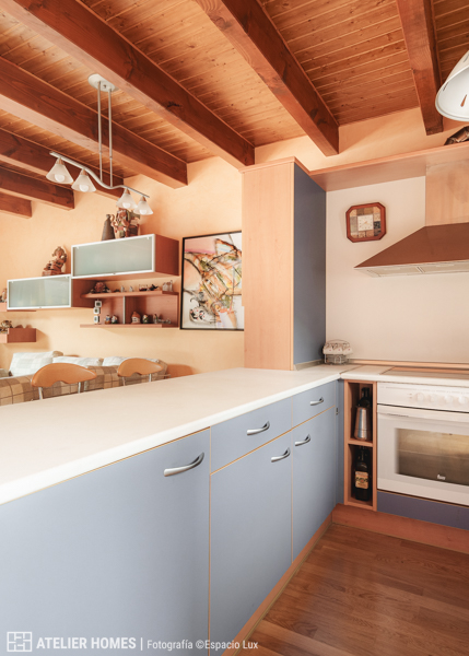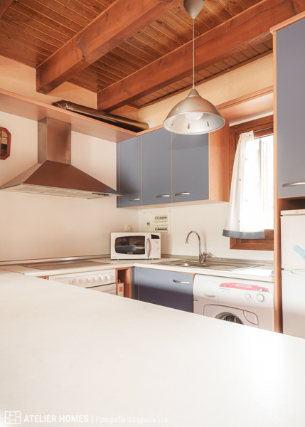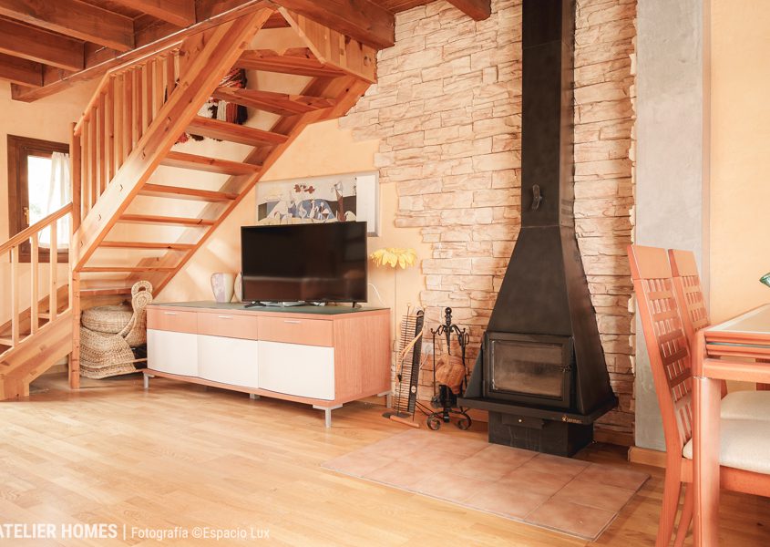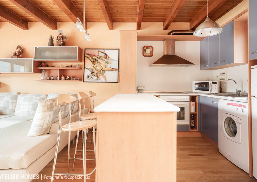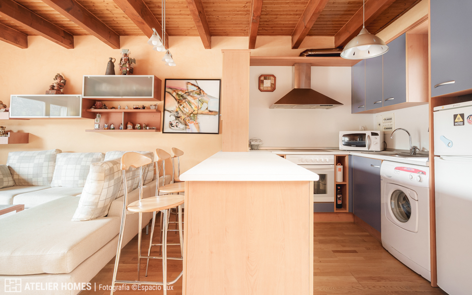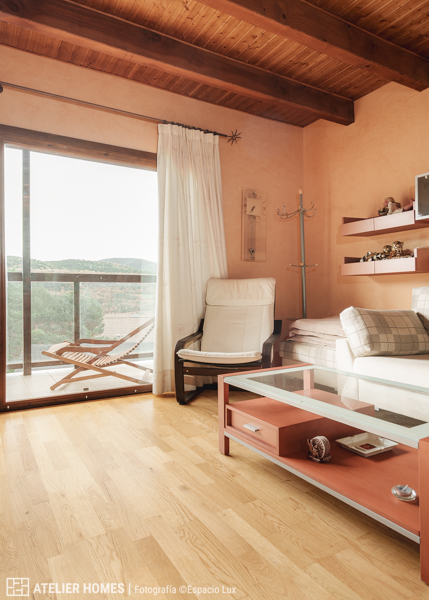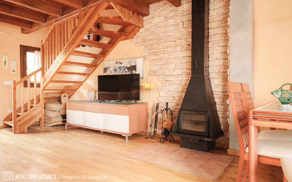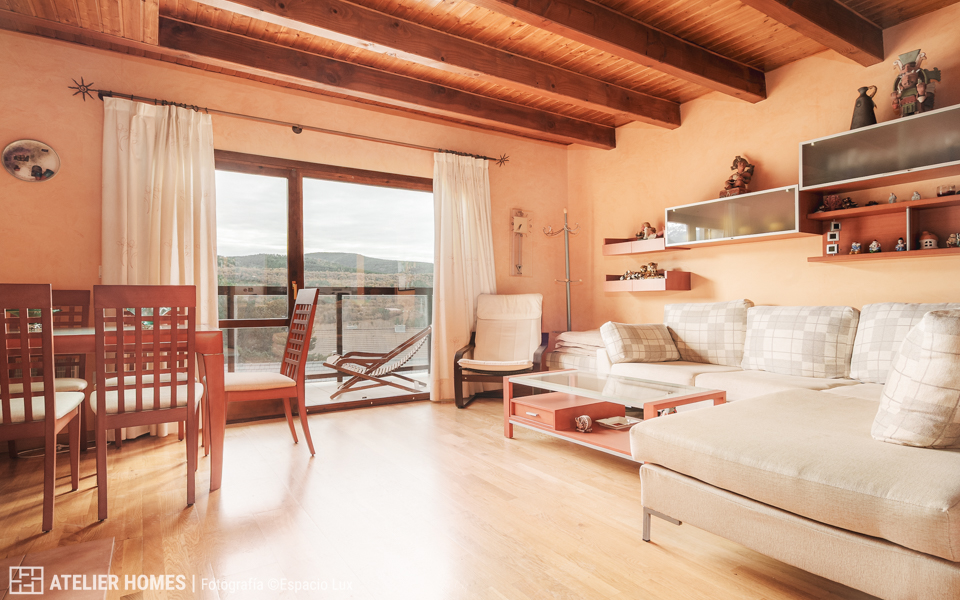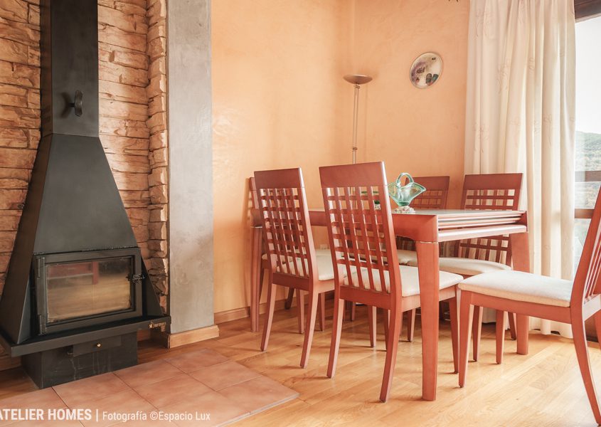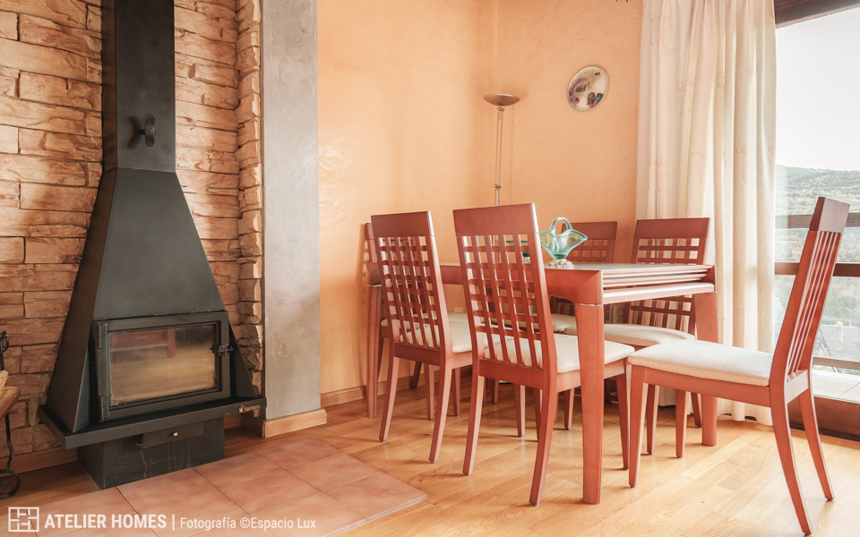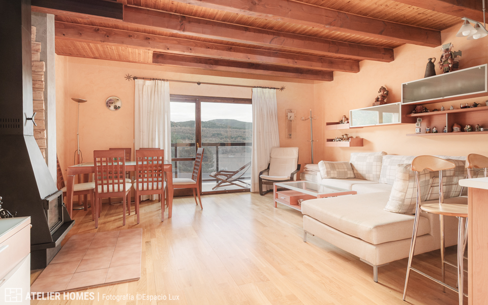 En la planta baja encontramos una luminosa y cálida estancia principal, con techos altos y vigas de madera, que integra el salón-comedor con chimenea de leña, zona de estar y acceso directo al balcón-terraza, desde el que se disfrutan impresionantes vistas abiertas con el valle y las montañas al fondo. La cocina abierta, totalmente equipada, cuenta con barra americana y mucha capacidad de almacenaje.