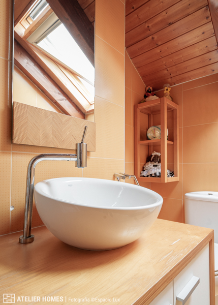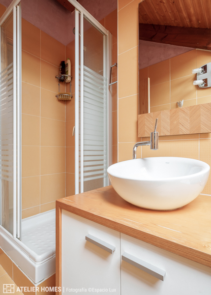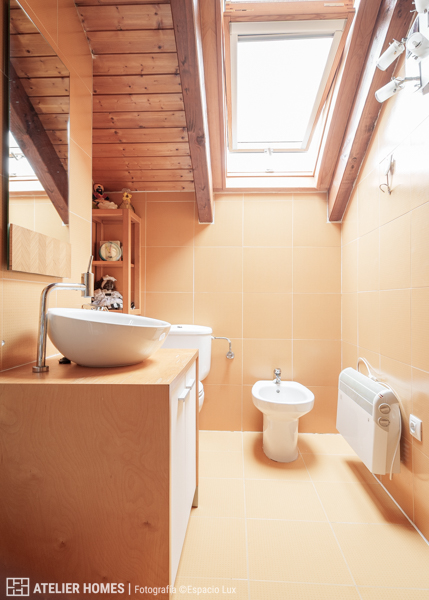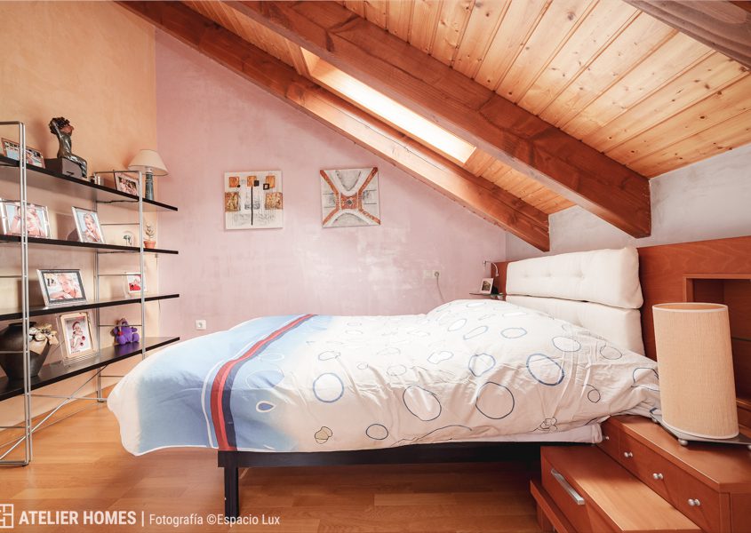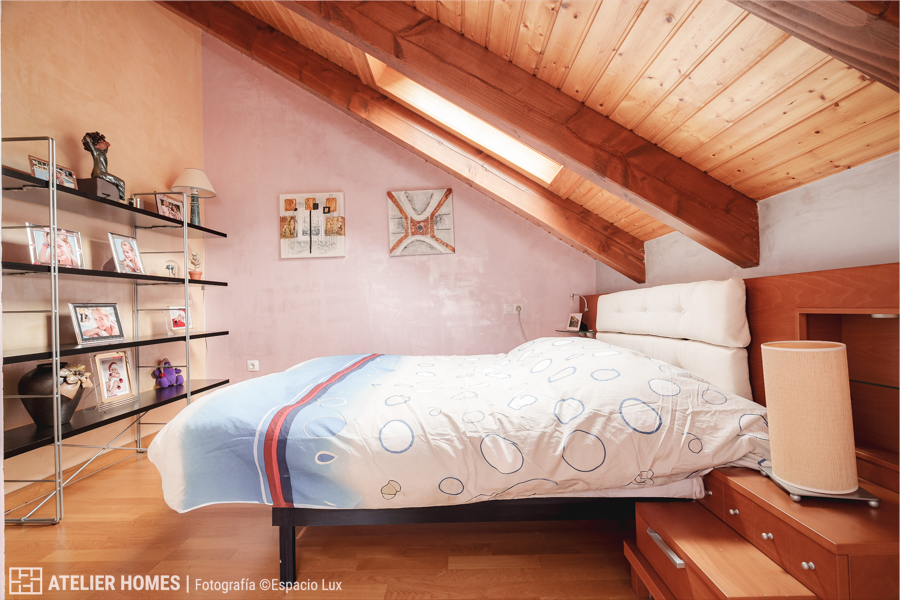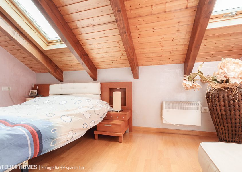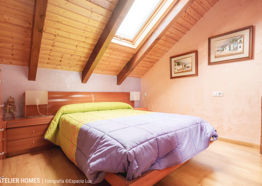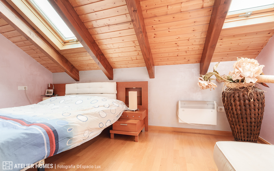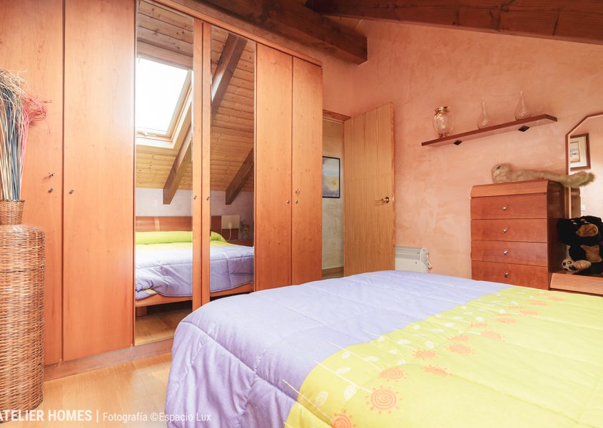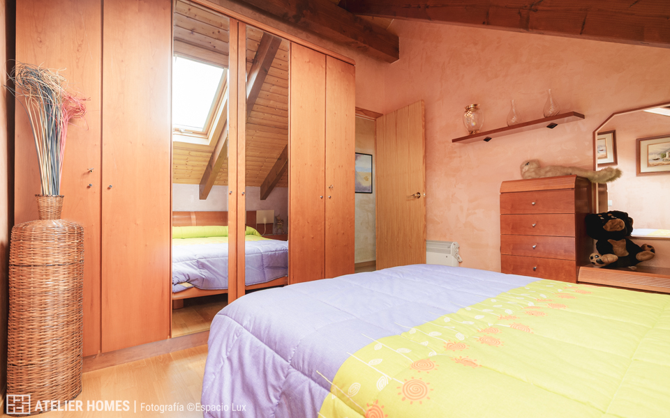 La planta superior está dedicada a la zona de descanso, con dos dormitorios dobles abuhardillados, uno de ellos con armario, y un baño completo con ducha.